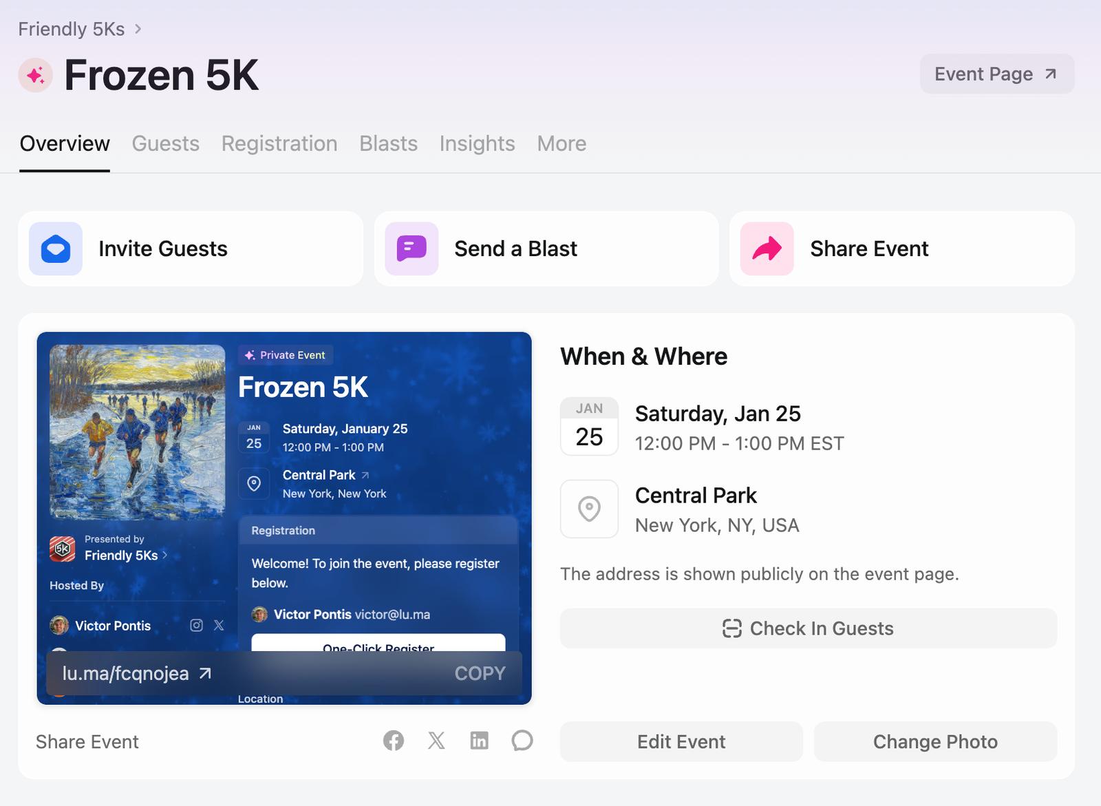 - Clicking the Edit Event button on that page to open up a panel that shows the event information
