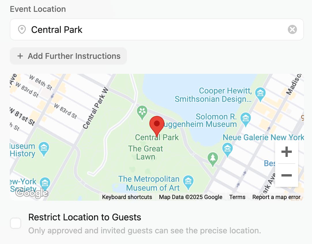 Visitors to the event page will still see the city and approximate location of the event but they won't see the address or the precise location. For example, if you're hosting an event at your house in New York City, the event page will show that it's in New York but not where your house is.