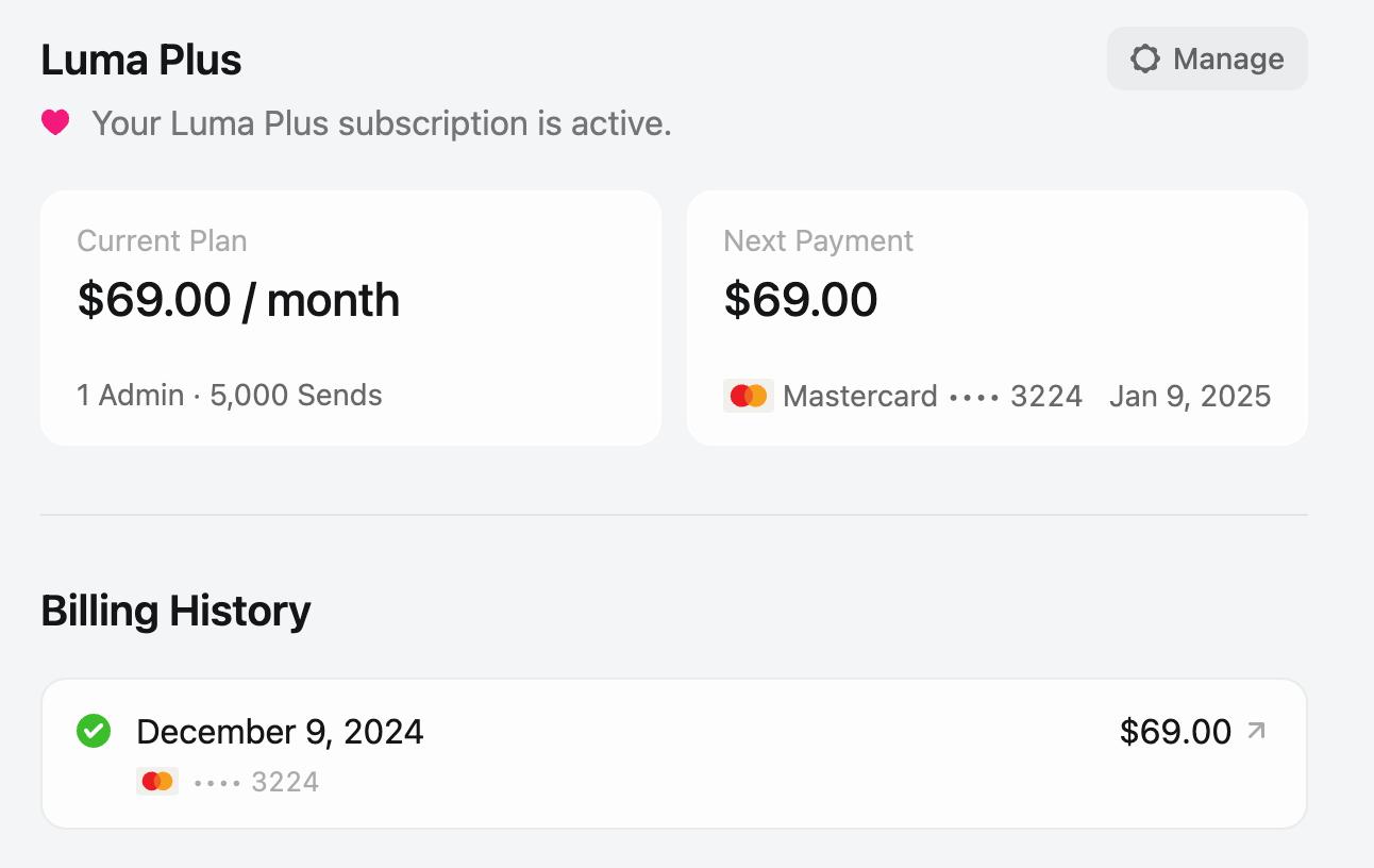 - Admin Seats - You can add extra admin seats beyond the 5 included with Luma Plus. Each additional seat costs $12/month (or $9/month when billed annually) and is prorated when added mid-billing cycle.