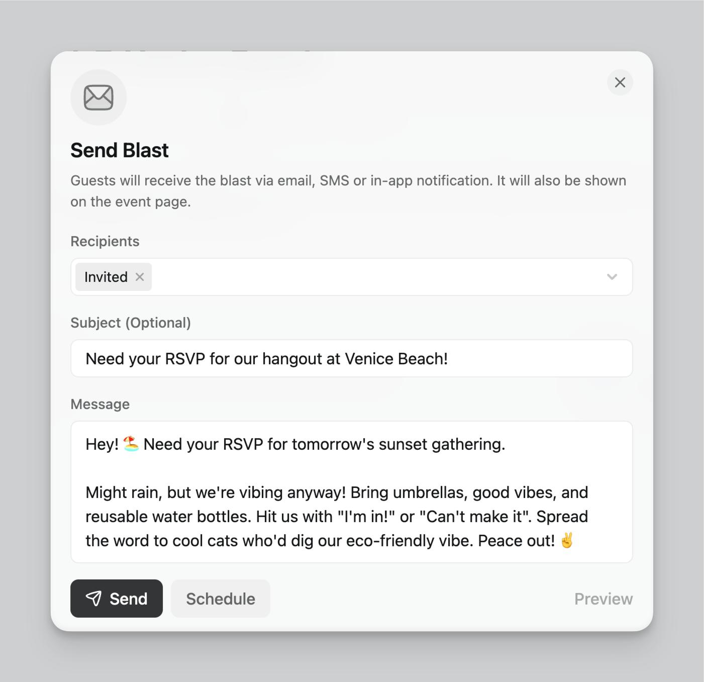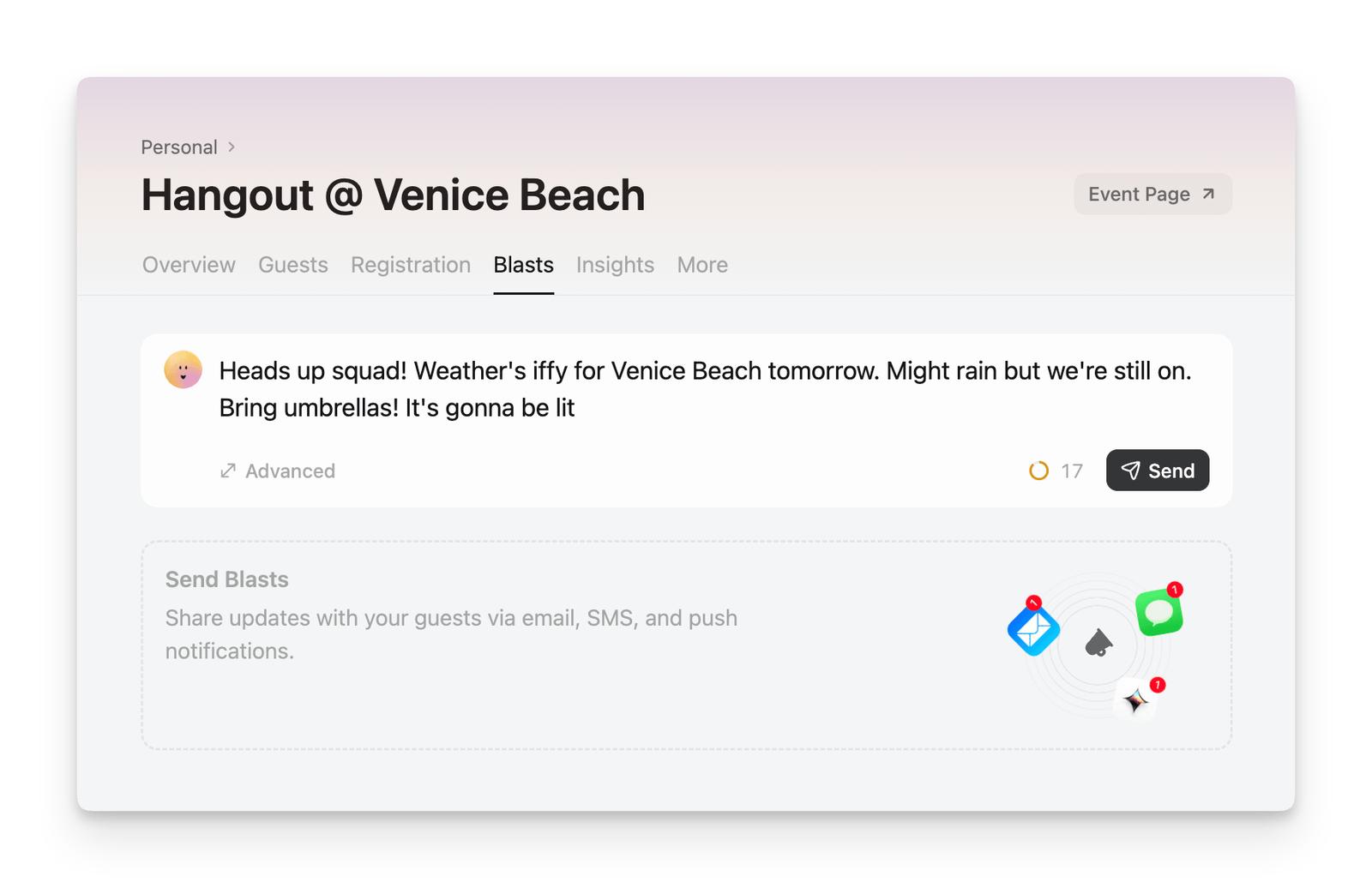 Blasts will be sent via email, SMS, and push notifications. Guests will receive an SMS if they have linked their phone number or a push notification if they have the Luma app. Blasts will also be displayed on the event page for logged-in guests.