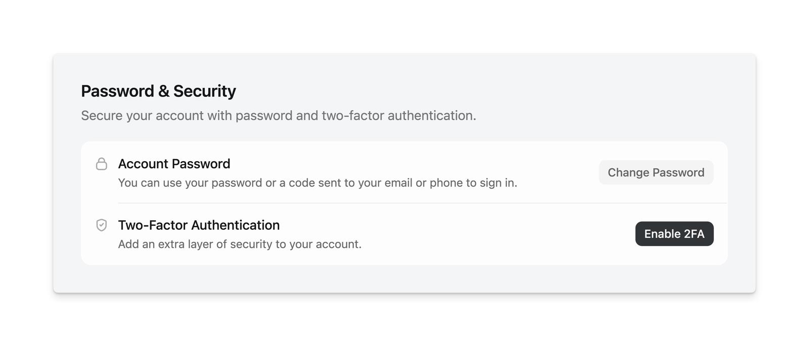 You can set up Two-Factor Authentication in your Settings > Password & Security. You'll need to verify your email and set a password before turning on Two-Factor Authentication.